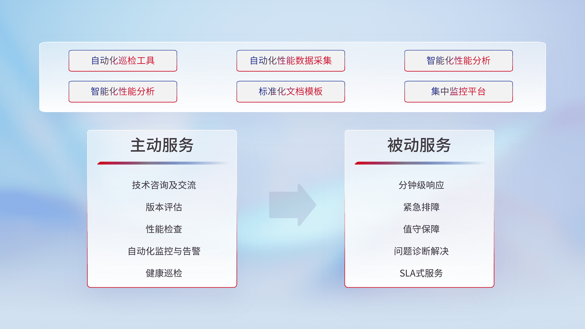 智能化工具和标准化文档,,,保障服务质量,,提供主动服务(包含技术咨询、、、版本评估、、、、性能检查、、自动化监控与告警、、、、健康巡检)和被动服务包含(分钟级响应、、、、紧急排障、、值守保障、、、问题诊断解决、、、、SLA服务)。。。